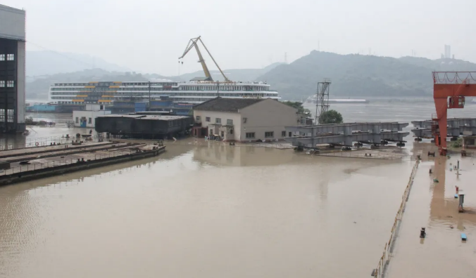 8月19~20日,長江洪峰先后到達東港船舶和川船重工。東港船舶船臺碼頭、104廠房、鋼結構新堆場、103總拼廠房被淹。川船重工2-4、2-5、2-6室內船臺,涂裝廠房、主機庫、變壓站、下水斜架絞車房等主要生產場地被淹,廠房內進水已達1米深。