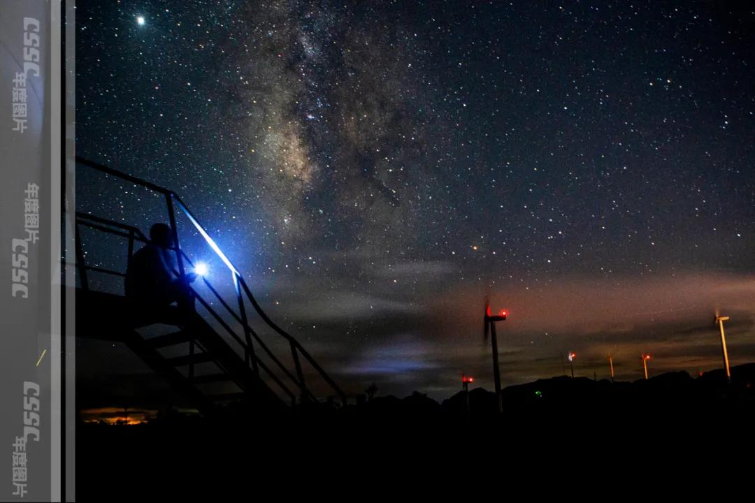 星幕下,中國船舶人在重慶中國海裝南天門風電場的漫天星空下,仰望星空,看著風機上的航空燈和璀璨的星河遙相呼應,這一切簡直美得妙不可言!