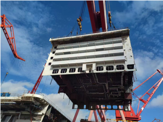 目前,由中國船舶集團旗下外高橋造船建造的第二艘國產大型郵輪,總組、總段搭載月度計劃均嚴格按計劃達成,項目已進入快速建造期。